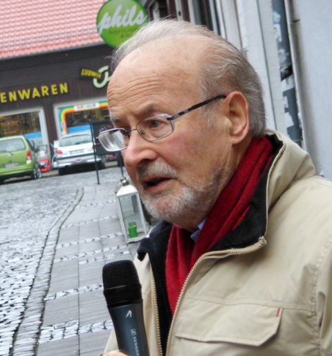 Dr. Helmut Kramer in der Langedammstr.14  bei seinem kurzen, unten dokumentierten Vortrag vor braunschweiger Bürgern (unten rechts der "Stolperstein")