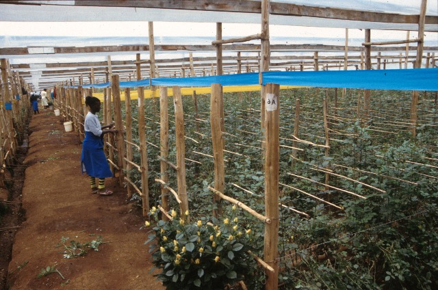 Rosenproduktion in Kenia. Die gelben und blauen Plastikbänder dienen der chemiefreien Bekämpfung von Schadinsekten (Fliegenfängerprinzip).