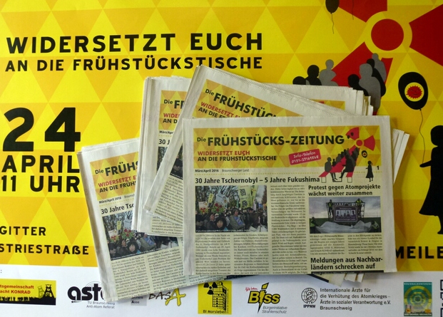 Am Sonntag, 24.04.2016 veranstalten wir anlässlich des 30. Jahres­tages von Tschernobyl und des 5. Jahres­tages der Katastrophe von Fukushima eine Frühstücksmeile auf der Industriestraße Nord vor Schacht KONRAD.