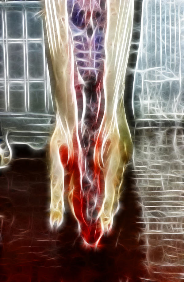 Der Hintergrund: Ich lebe seit fünfzehn Jahren vegetarisch und seit fünf Jahren vegan. Ich könnte jedes Mal kotzen, wenn ich durch den Supermarkt gehe und das Aas der Tiere präsentiert bekomme. Als Performancekünstlerin habe ich nichts gegen Körperflüssigkeiten und Kotzen, aber ich suche mir lieber selbst aus, wann ich mein Innerstes ausschütte.