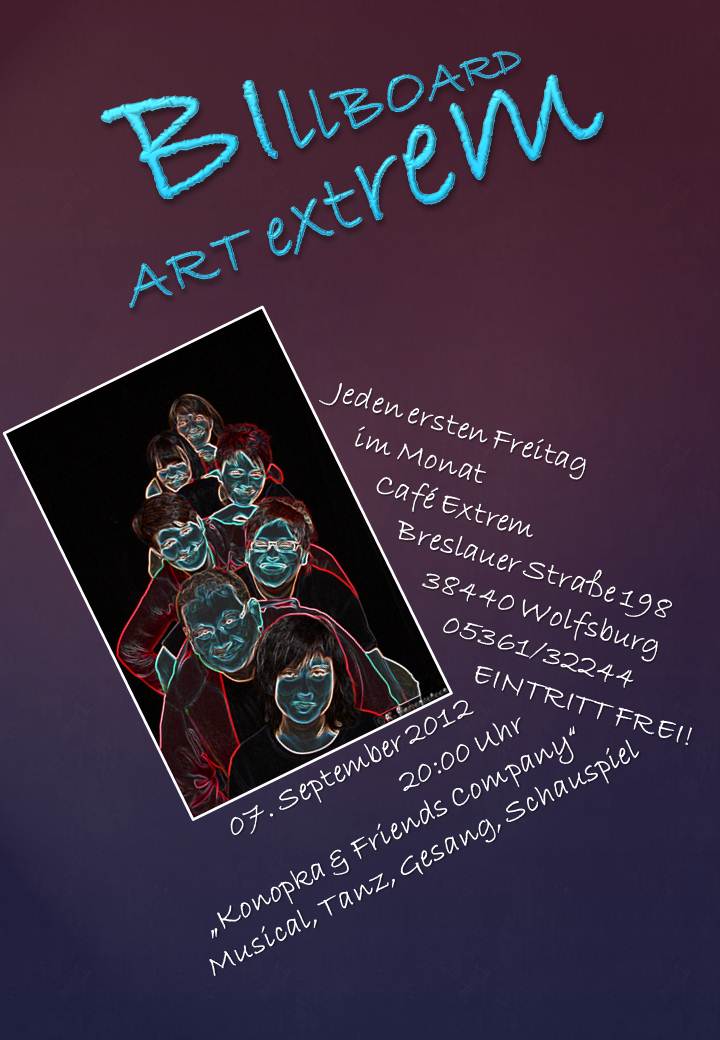 Die Wolfsburger Kulturwüste ... *räusper* ... -landschaft hat ein neues Gewächs: "Billlboard - ART extrem"! Jeden ersten Freitag im Monat Kleinkunst im Café Extrem. Eine Wundertüte, in der einfach alles stecken kann; Singer-/Songwriter, Bauchtanz, Feuerkunst ... Ich freue mich, zur Premiere die "Konopkas" begrüßen zu dürfen, einen Musical-/Show-Truppe, die ... aber lasst Euch überraschen. Freier Eintritt!