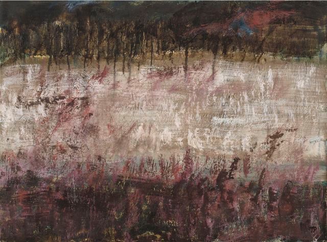 ästhetischem Kontext faszinieren. Auf die Leinwände werden mit großen, groben Pinselstrichen wilde, lebendige Landschaften geformt, die sowohl Ruhe als auch Dynamik ausstrahlen. Wie in dem Bild „Ockergrund", bei dem Thea Pini Farbstoffe direkt aus einem Flussbett entnahm um ihr Werk zu malen. So verwächst der Fluss mit dem Kunstwerk.