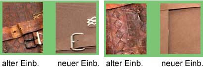 Es ist jedenfalls höchst problematisch, wenn mit der Patina des alten Ledereinbandes durch Ersatz mit einem unvollkommenen Imitat zugleich die historische Aura des Buchbandes vollkommen zerstört wird. Weniger wäre für die Neueinbindung mehr gewesen; wenn es schon nicht mehr der originale Einband ist, hätte er hinter dem gedruckten eingebundenen Inhalt ganz zurücktreten müssen. Im Zweifelsfall hätte der alte Einband, museal aufbereitet, als eigenständiger Gegenstand zusammen mit dem alten Schriftstück aufbewahrt und auch ausgestellt werden können. Gegen eine Kopie des Textes, eingebunden in eine - auch unvollkommene - Nachahmung des alten Einbandes wäre nichts einzuwenden.