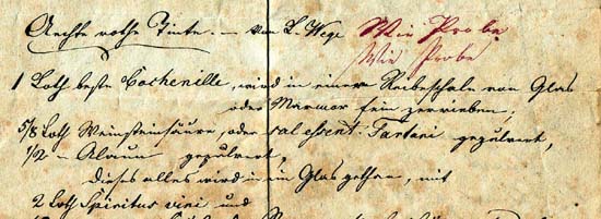 Tintenrezept (Ausschnitt): Aechte rothe Tinte - von L. Wege - Wie Probe - Wie Probe - 1 Loth beste Cochenille, wird in einer Reibeschale von Glas oder Marmor fein zerrieben; 5/8 Loth Weinsteinsäure, oder sal essent. Tartani gepulvert, 1/2 Loth Alaun gepulvert. Dieses alles wird in ein Glas gethan, mit 2 Loth Spiritus vini und ...