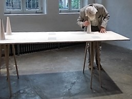 Und in den Allgemeinen Konsumverein führen Sie hoffentlich auch die Wege. Auch hier ist Ihre Aktivität gefragt ? Aktiv im Schauen muss jeder werden, um mit Lorenz Olivier Schmid das Unsichtbare der Staubbilder sichtbar werden zu lassen. Eine stille, fast labormäßige Ausstellungssituation ist aufgebaut: Tische, Glasplatten unterschiedlicher Größen und konische Gebilde. Man ahnt, dass es noch mehr geben müsste.