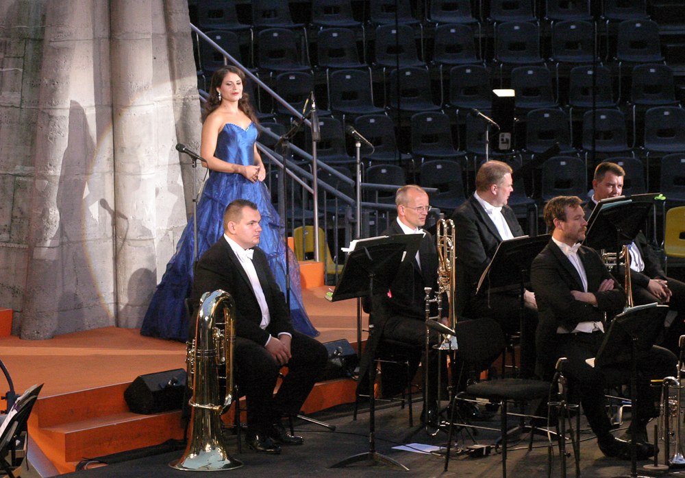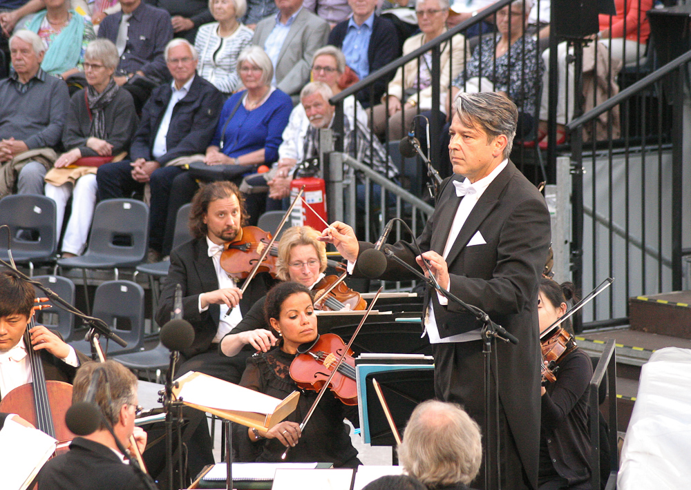 Mit einem bunten Potpourri („Topf zum Lächeln“) aus den zehn anstehenden Premieren und zwei Wiederaufnahmen der kommenden Spielzeit empfahlen sich die SolistInnen, Chor, Extrachor und Orchester in der Burgplatz-Arena. Technisch sehr sauber, machtvoll und etwas furios leitet der neue Generalmusikdirektor Srba Dinic das Staatsorchester zur Eröffnung mit Mozarts „La Clemenza di Tito“. Dass er auch die leiseren Schattierungen abzudecken vermag, freut die Gemeinde in seiner Interpretation von Puccini’s „Tosca“: Fast getragen darf Luciano Batinic, der in Vilnius schon den „Filippo“ und an der Semperoper in Dresden sang, unter dem Dom das „Te Deum“ interpretieren. Spontaner Applaus des Publikums.
