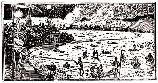 Schlacht von Roselies - Grob-Druck nach einem Aquarell von Félicien Defoin