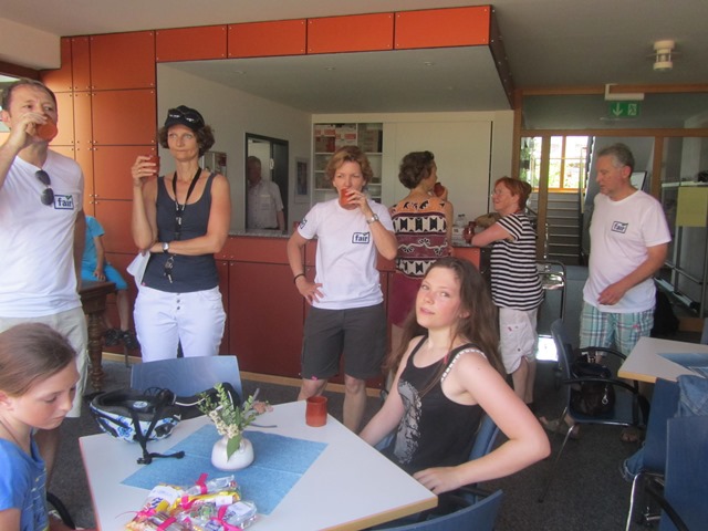 Vorbei am Südsee ging es dann ins Gemeindehaus in Stöckheim. Die Pastorin, Frau Becker, hatte volle Unterstützung zugesagt, denn sie steht auch hinter dem fairen Handel . Die Unterstützung wurde gebraucht, und die gab sie auch, indem sie die Tore öffnete, und wir durchschwitzt kalte Getränke und eine wundervolle Gaspacho zu uns nehmen konnten. Alle Anwesenden auf dem Gelände haben wir gleich mit eingeladen, zumal es nach dem Essen einen Vortrag von Uwe Meier gab über die Suche nach dem ultimativen Kakao in den Wäldern Kolumbiens. Die Gaspacho kam übrigens von Lor Vel, der Salat- und Suppenbar.