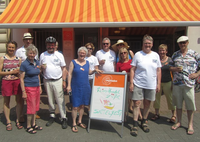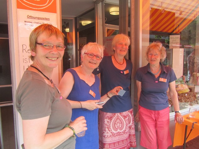 Welch freudige Überraschung: Herzlich und in Freuden wurde wir empfangen. Die Getränke wurden bereit gehalten und viele Gedanken und Ideen ausgetauscht. Vier faire Aktivistinnen bereiteten uns an diesem heißen Sonntag den wundervollen Empfang. Das war nicht erwartet worden, zumal sich viele erst vor der Ladentür kennen lernten. Der Austausch wird sicher weiter gehen, denn der FAIRE HANDEL ist eine großartige Bewegung und findet immer mehr Unterstützerinnen und Unterstützer weltweit.