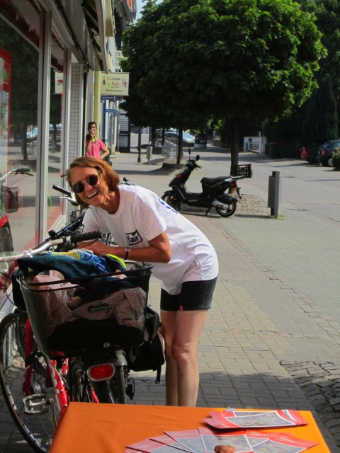 Doch dann musste der gastlich Ort bei Pastorin, Frau Becker, verlassen werden. Es ging weiter entlang der Oker unter schattigen Bäumen und mit guter Laune zum Weltladen nach Wolfenbüttel, gelegen in der Innenstadt, in der Fußgängerzone.