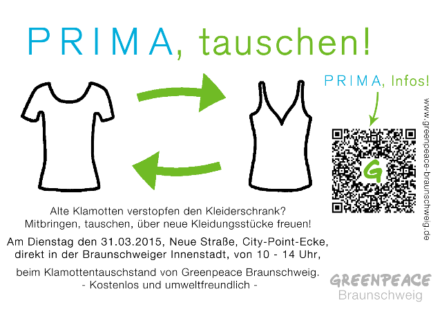 Am Dienstag, den 31. März 2015, stehen die Ehrenamtlichen von Greenpeace Braunschweig mitten in der Fußgängerzone (Ecke City Point, an der Kreuzung von Sack und Neue Straße). Dort feiern die Umweltaktivisten mit allen, die vorbei kommen und mitmachen möchten, die beliebte Klamotten-Tausch-Party. Morgens um 10:00 Uhr geht es los, gegen 14:00 Uhr endet die Fashion-Show.